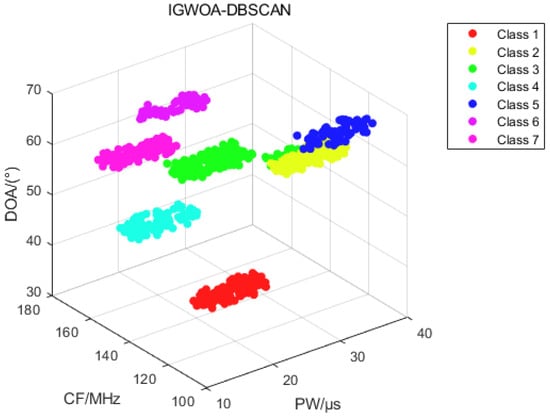 When sorting dataset 2, which contains only seven radars, the IGWOA optimization algorithm is used to find the optimal parameters for the DBSCAN algorithm proposed in Section 2.2. The number of iterations for the IGWOA optimization algorithm was set to 100, and the population size was set to 20. The parameters obtained through the IGWOA optimization algorithm were (8.025, 30, 3). After inputting these parameters into the DBSCAN optimization algorithm proposed in Section 2.2, Figure 13 was obtained.