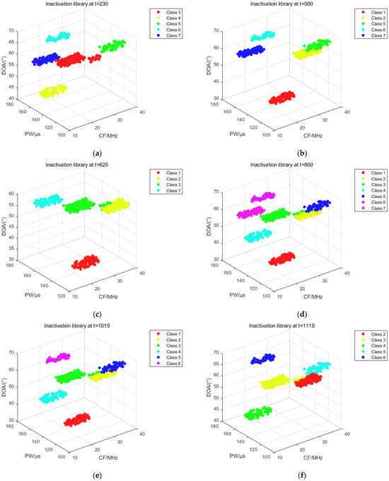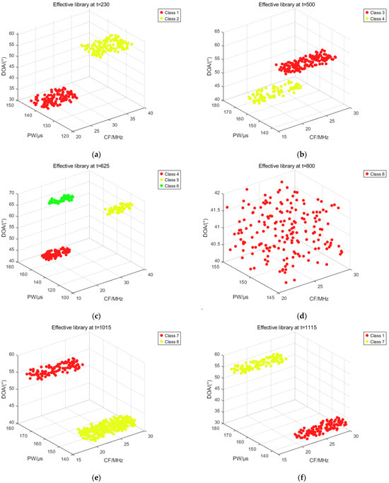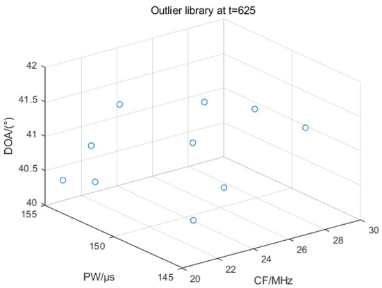 Figure 16 shows the distribution of outlier library pulses at t = 625. If the distance between the inflowing pulse and the center of mass of each sorted cluster in both the effective library and the outlier library is greater than the threshold value during online sorting, the pulse enters the outlier library. If the number of pulses is greater than the threshold MinPts, the IGWOA-DBSCAN algorithm is used to sort the pulses in the outlier library, and if the sorting is successful, new sorting clusters are added to the effective library, and pulses that have completed the sorting are deleted from the outlier library. The above figure shows the pulse distribution when the number of pulses in the outlier library is less than the threshold.