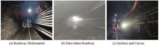 The environment of underground mine tunnels is complex, as shown in Figure 1. The surrounding rock of the tunnels is prone to deformation due to ground pressure, posing safety hazards such as rock falls and roof collapses (Figure 1a), some areas have high dust and fog concentrations and uneven illumination (Figure 1b), and the tunnels have many slopes and curves (Figure 1c). Actual measurement data show that in auxiliary transportation vehicle operation areas, such as tunneling tunnels and return airways, dust mass concentration can reach up to 500 mg/m3, and most areas have a low illumination of approximately 5 lux. At the same time, under the influence of mining, the contraction ratio of some tunnel cross-sections can reach 23% [4,5,6].The above complex conditions result in poor data quality collected by sensors. The field of view of a single sensor is insufficient to fully cover the vehicle’s driving area, increasing the difficulty of sensing the underground environment and placing higher demands on the robustness and reliability of sensing methods.