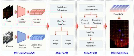 First, the raw data from LiDAR and camera are encoded into BEV features in a unified space. Then, the MoE-FLIM module is designed to assign fusion weights to different modal features through an expert-fuzzy logic inference mechanism. Next, the PMS-FFEM module is introduced, which uses a Gaussian pyramid for multiscale decomposition of features, and sequentially applies context enhancement and coordinate attention mechanism enhancement to generate BEV fusion features. Finally, the features are fed into five detection heads to perform detection of target category and position, target size, target angle, target height, and target center point offset, respectively.
