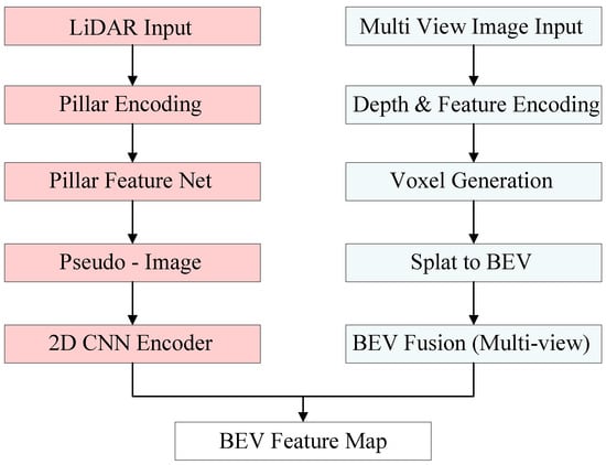 BEV feature encoding methods have emerged as one of the mainstream paradigms in object-detection technology for autonomous driving due to their unified spatial representation capabilities. In the field of visual detection, the Lift-Splat-Shoot method proposed in [24], maps monocular image data to the BEV space, implicitly extracting depth information from the image; Subsequently, methods such as BEVFormer [25], PolarFormer [26], and PETR [27] further enhanced BEV representation capabilities and model detection performance by introducing Transformer structures. In point cloud detection, Ref. [28] proposed the PointPillars method, which became a representative model for point cloud BEV object detection due to its real-time and efficient advantages; Ref. [29] further proposed CenterPoint, which integrated BEV encoding with an anchor-free detection mechanism, also demonstrating excellent detection performance.