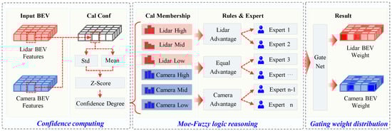 As shown in Figure 4, we first calculate the Local Confidence Map for both LiDAR and camera BEV features, then map the confidence values to fuzzy states using the Membership Function and defining fuzzy rules. These fuzzy states are then evaluated by the corresponding expert network, and finally, a Gating Network is introduced to fuse the outputs from the expert networks and dynamically adjust the fusion weights of the sensor features.