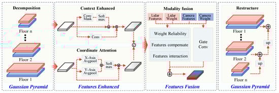 To address the issues of poor feature fusion quality and weak information expression caused by low-quality underground images and point cloud data, this paper proposes a multiscale feature enhancement and fusion module (PMS-FFEM) based on the Gaussian pyramid. This module primarily consists of multiscale decomposition and reconstruction using the Gaussian pyramid, as well as feature enhancement and fusion. The main workflow is illustrated in Figure 6. First, Gaussian pyramids are applied to decompose LiDAR and camera features into multiple scales. Then, at each scale, the features undergo contextual enhancement and coordinate attention enhancement, followed by fusion using reliability estimation and dynamic compensation strategies. Finally, a Gaussian pyramid is used to reconstruct the features across scales, resulting in a multiscale fused representation of the multimodal features.