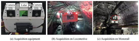 The data acquisition equipment is shown in Figure 7 and consists of two RGB cameras, one laser radar, and one portable computing device. The image acquisition resolution is 640 × 480, and each frame of laser radar point cloud data contains approximately 24,000 points. The image and laser radar point cloud data are synchronized at the frame level through a unified timestamp. We employed three data acquisition methods: manual scanning, motor vehicle-mounted scanning, and monorail-mounted scanning. During data acquisition, the laser radar sampling frequency was set to 10 Hz, and the camera sampling frequency was set to 3 Hz. To prevent data loss, camera data timestamps were used to index and match laser radar data, ensuring alignment between radar and image data with an error margin of ±50 ms. Additionally, to synchronize the camera and LiDAR data for subsequent annotation, this study used the official Livox tool, Livox Camera-LiDAR Calibration Tool, for external parameter calibration. This involved capturing standard checkerboard calibration plates and collecting corresponding point cloud and image data. By combining image corner points with point cloud edge feature extraction, the PnP algorithm was used for initial estimation, followed by nonlinear least squares optimization to further refine the pose, ultimately achieving high-precision camera -radar external parameter calibration.
