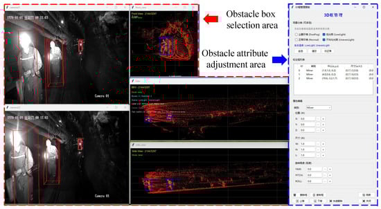 The dataset consists of a total of 3298 multimodal perception data sets, including 2632 sets for training and 666 sets for testing. It defines 5 types of typical obstacle targets: Miner, Mine Car, Device Box, Material, and Notice Board, as well as 4 types of typical environmental scenarios: Normal, Dust Fog, Low Light, and Uneven Lighting. As shown in Figure 8, we utilized Python to develop an annotation tool for the dataset, which captures location, category, size, and orientation information.