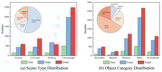 The dataset distribution is shown in Figure 9. In terms of scene types, the underground environment is predominantly characterized by uneven lighting and low-light conditions, accounting for 54.9% and 19.3%, respectively. Normal scenes and dust and fog conditions together make up a smaller portion, accounting for 13.1% and 12.7%, respectively. Regarding target categories, the highest proportion is for Miner, accounting for 46.8%, reflecting the high occurrence frequency of miners in underground coal mine production scenarios. Miners are key objects in environmental sensing and safety monitoring. Next, Mine Car and Notice Board account for 21.3% and 19.0%, respectively. Overall, the dataset provides rich information on transportation and management scenarios, offering significant research and practical value.