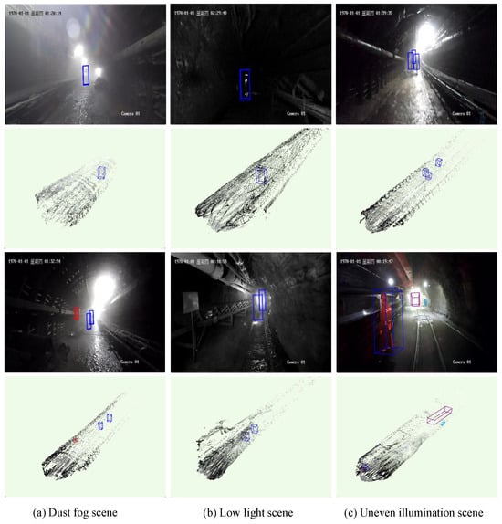 Figure 11 shows the detection performance of the Mine-DW-Fusion method under the complex working conditions of a typical coal mine. The results indicate that the model can effectively recognize and locate personnel and equipment targets in low-light and uneven lighting conditions, exhibiting strong resistance to interference. Even in scenes with significant dust and fog, although the model’s detection performance decreases, it still maintains a certain level of personnel detection capability. These results suggest that the fusion of multimodal information by the Mine-DW-Fusion model yields promising performance even under challenging conditions.