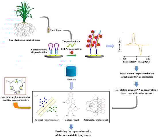 However, a literature review shows that no similar work has been carried out on the detection of mineral nutrient deficiency in plants using smart microRNA biosensing platforms. In addition, no work has reported a comprehensive analysis (including linear range, limit of detection, and reproducibility) of electrochemical schemes for the measurement of microRNAs in plant samples. Considering the fact that electrochemical setups are more cost-effective than optical setups in their development as a portable device, this study pursued three main objectives: (a) to investigate the performance of an electrochemical biosensing platform that has always being used for analyzing microRNAs in human samples but now for the measurement of microRNAs in plant samples; (b) to identify the effective microRNA compounds in plants’ response to mineral nutrient deficiencies; and (c) to develop an efficient machine learning scheme for the detection of type and severity of the deficiencies by having the concentration of effective microRNAs measured in plant amples as machine inputs. In this case, based on the results obtained in this work and our previous studies, an electrochemical device can be fabricated for the efficient monitoring of environmental stresses in rice plants.