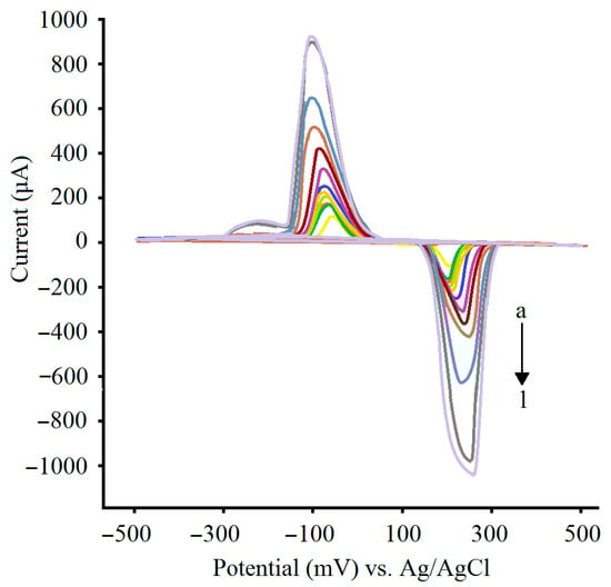 The cyclic voltammograms obtained by the biosensor at various concentrations of the studied microRNAs, (a) 0, (b) 10−20, (c) 10−19, (d) 10−18, (e) 10−17, (f) 10−16, (g) 10−15, (h) 10−14, (i) 10−13, (j) 10−12, (k) 10−11, and (l) 10−10 M. The cyclic voltammogram corresponding to each concentration shows a voltammogram with the closest peak to the mean peak value obtained for all studied microRNAs.