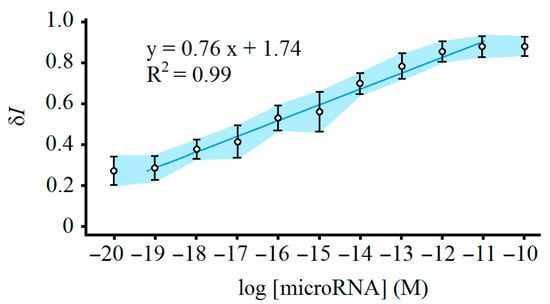 Although this electrochemical biosensing method provided promising results in measuring microRNA concentrations in human clinical specimens in previous studies [41], it was necessary to validate its performance in measuring microRNA concentrations in total RNA samples extracted from plants. As discussed earlier, the higher the electric peak current of the biosensor, the higher the concentration of the target microRNA in the sample is. Therefore, to quantify the output of the biosensor, a relative current response (δI) was defined as the biosensor response (Equation (1))