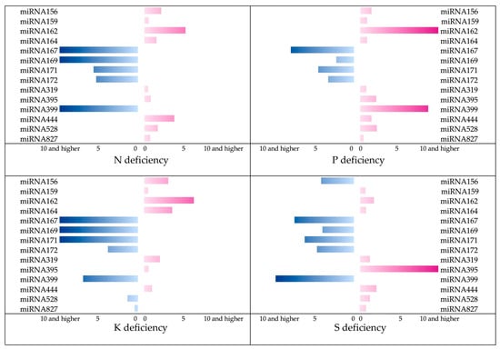 Times of changes in the studied microRNAs towards various nutrient deficiencies. Pink color shows overexpression, while the blue color shows suppression.