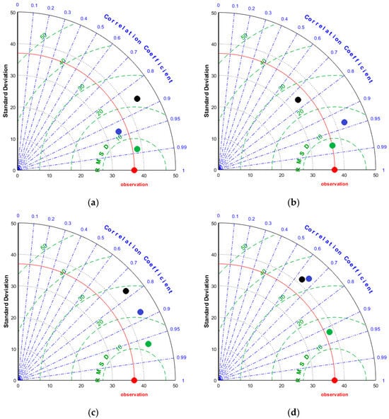 Taylor’s diagrams for the prediction of the severity of nutrient deficiency. Red-colored dots are the observed values, while the other dots belong to the predicted values using the RF (green), ANN (blue), and SVM (black). (a) N deficiency, (b) P deficiency, (c) K deficiency, and (d) S deficiency.