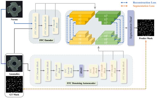 As illustrated in Figure 1, our FFC-AD framework comprises a frozen FFC encoder, an FFC denoising autoencoder that reconstructs anomalies into normal representations, and a segmentation head that distinguishes multi-level local/global FFC features to output the predicted segmentation mask. The FFC encoder and the FFC denoising autoencoder are constructed using FFC encoder blocks and FFC decoder blocks. The FFC encoder block follows the ResNet-18 design [], while the FFC decoder block replaces all downsampling layers with upsampling layers. The training process of the proposed FFC-AD consists of two stages: training the FFC denoising autoencoder and training the segmentation head. In the first stage, the FFC encoder takes normal images as input, whereas the FFC denoising autoencoder receives images with anomalies generated via DRAEM []. Multi-level local/global features extracted from these inputs are aligned using reconstruction loss. Once the FFC denoising autoencoder acquires the ability to reconstruct normal images from anomalous ones, we proceed to train the segmentation head for precise anomaly localization. This is achieved by feeding normal images into the FFC encoder and anomalous images into the FFC denoising autoencoder. During the testing phase, anomaly samples are fed into both the FFC encoder and the FFC denoising autoencoder, and the output prediction mask serves as the predicted segmentation result. The final anomaly detection result is obtained by taking the maximum value in the mask.