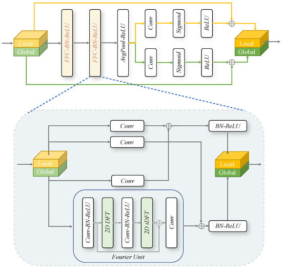 As illustrated in Figure 2, the FFC module initially partitions the feature maps into two branches: a local branch and a global branch. The local branch uses conventional convolution to extract local details, whereas the global branch leverages the Fourier Transform to obtain the global context. The steps involved in the Fourier Unit are as follows: