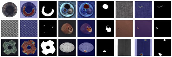 We followed the popular DRAEM [] method for anomaly simulation, which utilizes an additional dataset, the Describable Textures Dataset []. All our experiments were conducted on a single NVIDIA RTX 3090 GPU (NVIDIA Corporation, Santa Clara, CA, USA). with a total batch size of 8 and training for 20,000 iterations. Consistency in the input data is maintained by normalizing the input images using the mean and standard deviation values obtained from the ImageNet dataset [], followed by resizing to a uniform size of 256 × 256 pixels.