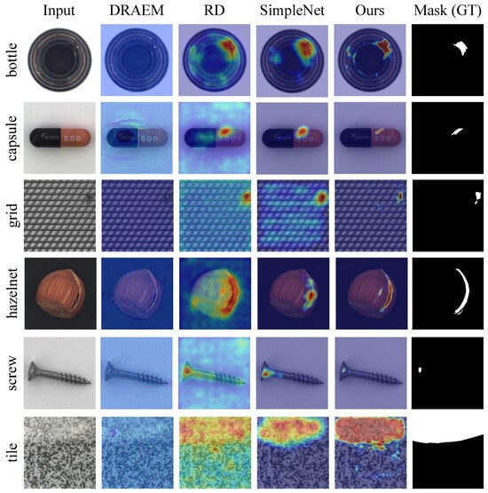 Figure 5 presents a visual comparison of the results on the same sample using different methods. It can be observed that DRAEM [] performs poorly on low-resolution images, failing to effectively identify abnormal regions. In contrast, RD [] demonstrates a better capability in detecting various types of anomalies, with abnormal areas being more accurately localized. However, RD often suffers from a high false positive rate. For instance, in the “bottle” and “tile” samples, the significant number of false alarms could lead to unnecessary alerts in practical applications. SimpleNet [] enhances the model’s generalization by adding noise at the feature level. Nevertheless, due to the lack of explicit segmentation constraints, it struggles to precisely locate the boundaries of small anomalies, as seen in the “capsule” and “screw” samples, indicating room for improvement in its segmentation performance. Our method achieves the best segmentation for both texture and object categories, with accurate, shape-preserving outputs handling anomalies of all sizes. Notably, in the “grid” and “screw” samples, it significantly reduces false positives while accurately localizing anomalies, demonstrating superior performance. In summary, our method excels across diverse anomaly detection scenarios, with great practical application potential.