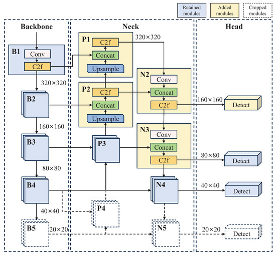 In the detection head, a detection head with scale of is introduced and connected to the layer, which improves the ability to locate and recognize small objects. At the same time, the detection head with scale of and its redundant layers (, , ) are cropped to decrease the parameters. The neck structure is simplified to achieve lightweight feature fusion without reducing detection accuracy.