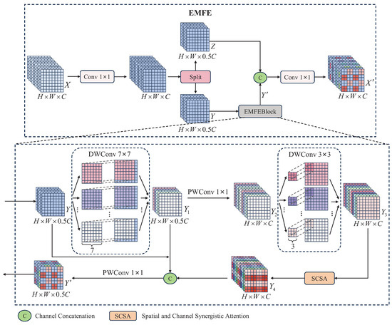 Start with an input feature map (where H and W are the height and width of the feature map, and C is the number of channels). Firstly, a convolution is used to transform the features of X. Then, the feature map is split along the channel dimension into two equal parts, and . Y is fed into the EMFEBlock module for feature extraction and enhancement to obtain , and the other part of Z is fed into the Concat module for splicing with . Finally, the spliced result is used as the input to obtain the output result by a convolution again. The computational process can be formulated as follows: