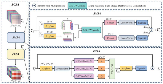 SCSA enhances feature representation at both spatial and channel levels to provide more comprehensive and detailed support for subsequent detection. SCSA consists of shared Multi-Semantic Spatial Attention (SMSA) and Progressive Channel-wise Self-Attention (PCSA). SMSA integrates multi-semantic information to generate comprehensive spatial feature representations, which provide valuable spatial prior information to PCSA and guide it to adjust channel feature weights more accurately. PCSA implements feature interaction at the channel level through a single-head self-attention mechanism, alleviating conflicts between multi-semantic features. The SCSA computation process is shown in Figure 4. SMSA decomposes the input feature map into two unidirectional 1D sequence structures and along the height (H) and width (W) dimensions, and uniformly divides them into n equally sized sub-features. Subsequently, the MS-DWConv1d module is used to extract the semantic information of the sub-features. Finally, is generated by concatenating, applying Group Normalization (GN), and using the Sigmoid activation function on the output of MS-DWConv1d. The process can be formulated as follows: