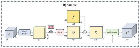 Therefore, the DySample module is used for dynamic upsampling in the neck. DySample makes upsampling more flexible and accurate by formulating upsampling from the perspective of point sampling. Compared to kernel-based upsamplers (e.g., CARAFE [35] and FADE [36]), DySample avoids a higher computational cost. Its sampling process is shown in Figure 5. Given an input feature map (where C denotes the dimension of X, and H and W denote the height and width of X, respectively), an upsampling scale factor r and a static range factor of 0.25, pixel shuffle is applied to obtain the output of size . (We conducted preliminary experiments by setting the static range factor r to 0.1, 0.25, 0.5, and 1 for comparison. The results showed that the model achieves the best performance when r = 0.25, which is therefore adopted in this study.) The output is multiplied by the static range factor 0.25 and passed through a linear layer to obtain the offset (where d = 2, which represents the x and y coordinates of the sampling point). Finally, O is added to the original sampling grid P to obtain the sampling set . This process can be formulated as follows: