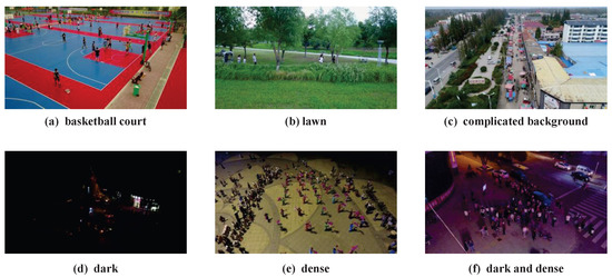 The VisDrone2019 dataset was collected and annotated by the AISKYEYE team from Tianjin University. This dataset consists of 288 video clips, 261,908 video frames, and 10,209 still images. There are 6471 images in the training set, 548 images in the validation set, and 1610 images in the test set. These data were collected by UAV cameras and cover a wide range of areas. They include footage from both urban and rural environments across 14 cities in China, featuring 10 different object categories such as pedestrians, people, and cars. The scene density ranges from sparse to crowded, which fully demonstrates the wide adaptability of UAV applications and reflects the challenges of object detection in UAV aerial images, meeting the experimental requirements of this study. Some data samples are shown in Figure 6.