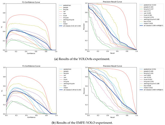 Figure 7 shows the experimental results of YOLOv8s and EMFE-YOLO on the VisDrone2019-val dataset. As can be seen from the precision–recall curve in the figure, EMFE-YOLO covers a larger range, which indicates that the model has a better balance between precision and recall. In the F1–confidence curve, EMFE-YOLO shows a higher F1 score, verifying the effectiveness of the model.