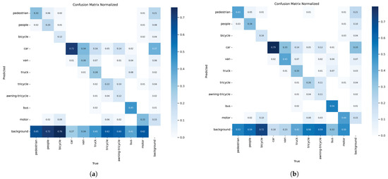 As shown in Figure 8, the confusion matrices of YOLOv8s and EMFE-YOLO are constructed to demonstrate the model’s classification performance on ten different categories in the dataset. The rows and columns of the confusion matrix represent the true and predicted categories, respectively. The values on the main diagonal show the percentage of correct classifications for each category. Darker colors indicate higher accuracy. The other areas represent incorrect predictions, with deeper colors showing a higher percentage of errors for the corresponding category. In Figure 8, the color of the main diagonal elements in the EMFE-YOLO confusion matrix is noticeably darker than YOLOv8s. Additionally, each main diagonal element’s value is higher than the corresponding value in YOLOv8s, indicating that the EMFE-YOLO model has improved accuracy in predicting all ten categories. Among them, the three categories with the greatest improvement were pedestrian, people, and motor, which were improved by 11%, 14%, and 11%, respectively. The last row of the EMFE-YOLO confusion matrix shows a lighter color, indicating that the model’s probability of misclassifying objects as background has been significantly reduced. This further validates its robustness in complex scenarios.