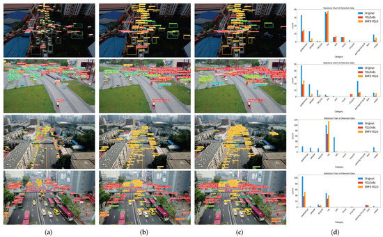 Detection results of YOLOv8s and EMFE-YOLO on real UAV aerial images: (a) ground truth annotations, (b) detection results produced by YOLOv8s, (c) detection results produced by EMFE-YOLO, (d) statistical table of the detection results.