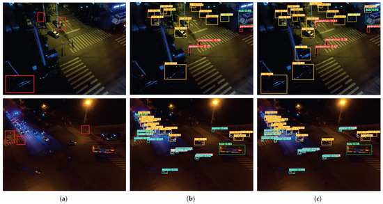 Experimental results of EMFE-YOLO and YOLOv8s on aerial images containing difficult samples. (a) Original images, with red boxes highlighting difficult cases such as occluded or motion-blurred objects. (b) Detection results of YOLOv8s. (c) Detection results of EMFE-YOLO.