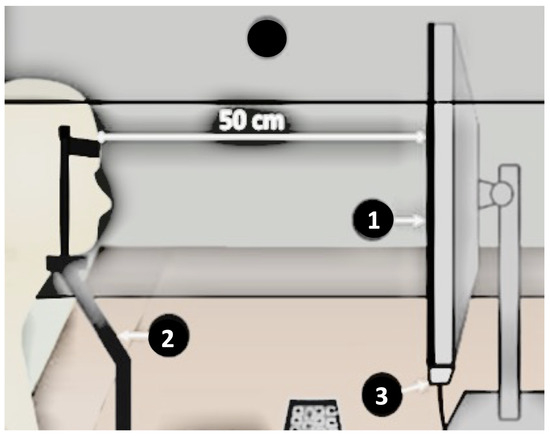 Diagram of the used system for eye-tracking acquisition. (1) Display, (2) chin rest, and (3) eye tracker.
