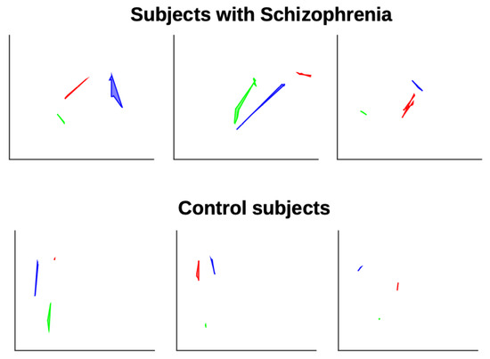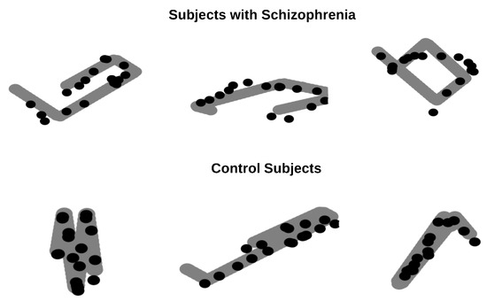 Figure 5 shows the polygons formed for the subjects with SZ (top panel) and for the control subjects (bottom panel). For illustration, three different polygons of the trajectory are presented. In general, it can be observed that most of the subjects with SZ generate polygons with a larger area. This suggests that consecutive points do not form a straight line. The values of the average areas of the polygons calculated with different numbers of points are shown in Table 1. Here, 250 ms corresponds to n = 15 points, since we have a sampling frequency of 60 Hz. The value is presented in normalized units (NUs), that is, the area of each segment (for a given n) was divided by the maximum area (from SZ and control) and then the average area of the normalized segments was calculated. As can be seen from Table 1, the mean area of the polygons is lower in the control group than in the SZ group, but no statistical differences were found.