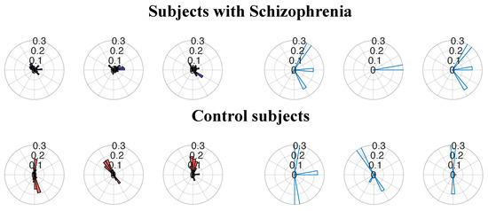 Figure 4 shows the probability density functions in the polar plane that illustrate the distribution of for the target trajectory directions (empty bars) and the gaze trajectory directions (filled bars). The top panel displays the probability density functions for the subjects with SZ, while lower panel displays the probability density functions for the control subjects; the angles were computed between consecutive samples. The probability density functions for the subjects with SZ show a tendency towards uniformity, indicating a deviation from the target direction. On the other hand, the control groups present the probability density functions similar to the target ones. Despite the tracking not being perfect, there is a significant similarity between the target and gaze probability density functions. Note that target the probability density functions may show bars in different directions due to the target changing direction each time it reaches a boundary.