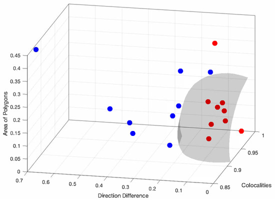The feature space for evolving regions, angle difference, and co-occurrence, where the blue balls are the participants with SZ and the red balls are the control participants. The gray surface is the discriminant function.