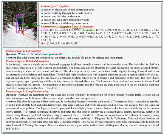 Despite their achievements, current models struggle with specialized tasks that require nuanced understanding of human activities, particularly those involving poses and actions. This limitation constrains their application in assistive robotics, healthcare, and human–computer interaction [10,11,12,13]. A significant challenge is the lack of specialized vision–language instruction-following data. While LLaVA introduces a method for converting image–text pairs into instruction-following data using GPT-4 [14], it primarily relies on image captions and object bounding boxes, which lack the precision needed to interpret complex human activities. Consequently, models trained on such data show limited performance in tasks requiring detailed understanding of human pose and action.