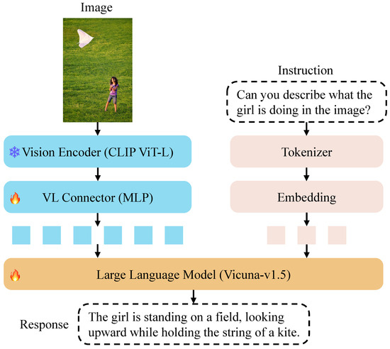 - Large Language Model: The mapped visual embeddings are concatenated with the text token embeddings, and the combined embeddings are input into the LLM Vicuna-v1.5 [42]. The LLM generates textual responses conditioned on both the visual and textual information.