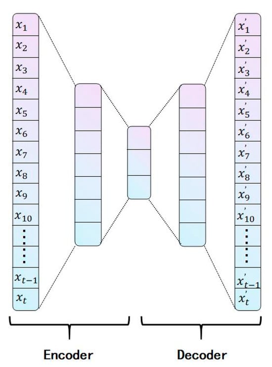 An autoencoder [38] is a conventional unsupervised neural network model that consists of the following two key components: an encoder and a decoder. The encoder extracts features from high-dimensional input signals, while the decoder reconstructs the low-dimensional features back into high-dimensional signals. The basic structure of the autoencoder is illustrated in Figure 1. Assuming the original input data is , it first passes through the encoder. In the first fully connected (FC) layer, the n-dimensional data is compressed to seven dimensions. Subsequently, the second FC layer further compresses the seven-dimensional data to three dimensions, obtaining a low-dimensional feature representation; this process constitutes the encoding stage. The three-dimensional data is then expanded back to seven dimensions via an FC layer, followed by another FC layer that reconstructs it into n-dimensional data, yielding the decoder’s output . By comparing the similarity of the input to the reconstructed output , the reconstruction performance of the autoencoder can be evaluated. The reconstruction performance largely reflects the effectiveness of the autoencoder in condition monitoring.