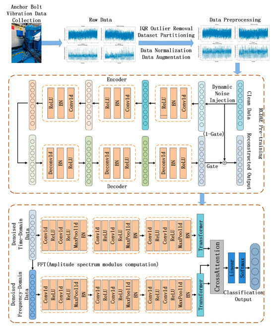 To address the aforementioned challenges, this study proposes an end-to-end time–frequency dual-domain adaptive diagnostic framework consisting of an improved Residual Convolutional Denoising Autoencoder (RCDAE) and a CNN–Transformer fusion network. The RCDAE achieves the multi-condition adaptive denoising of vibration signals using a Dynamically Multimodal Synergistic (DMS) loss function that combines Mean Squared Error (MSE) and Structural Similarity Index (SSIM), eliminating the need for manual parameter tuning in conventional methods. Furthermore, a hybrid RCDAE–CNN–Transformer architecture is created to extract local transient features using convolutional layers while capturing long-range temporal dependencies with Transformer modules. A cross-attention mechanism is introduced to enable dynamic complementary fusion of time–frequency features, which significantly improves discriminative representation capability for weak fault signatures in the presence of strong noise.
