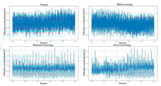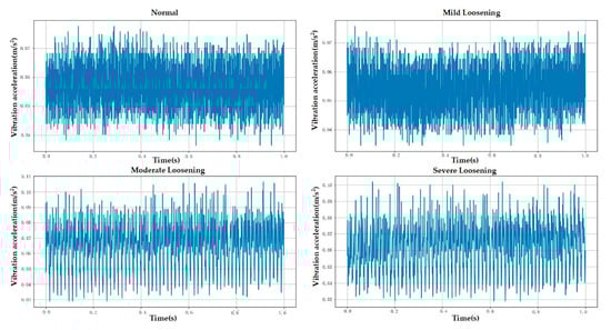The experimental data used in this study were collected from an Otis escalator with a rated operating speed of 0.5 m/s and an inspection speed of 0.3 m/s. All experiments were conducted while the escalator operated in inspection mode. The sensor employed was a piezoelectric single-axis vibration sensor with a sampling frequency of 1000 Hz, recording each fault category for 5 min. The sensor was mounted at the location shown in Figure 4 using a magnetic base. The experiment collected data for anchor bolts in four different loosening states. The escalator bolts were of the M16 specification and tightened to a nominal torque of 130 Nm. Consequently, mild, moderate, and severe loosening were defined as torque values equivalent to 90%, 80%, and 70% of the tightening torque, respectively [28,43]. Raw data contained outliers caused by abnormal mechanical impacts during acquisition, which could compromise diagnostic accuracy. This study used the Interquartile Range (IQR) method to detect and eliminate these anomalies. Given the small number of outliers (less than 0.5% of total samples), removing them had no significant effect on the underlying data distribution. Figure 4, Figure 5 and Figure 6 demonstrate the experimental setup, representative raw signals, and sanitized datasets.