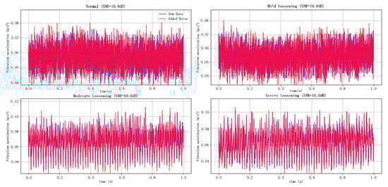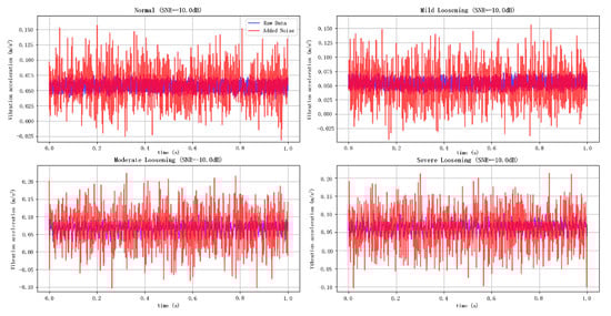 As shown in Figure 7 and Figure 8, the noise-contaminated data illustrates the original signal and its counterparts contaminated with Gaussian white noise at SNR levels of 10 dB and −10 dB, respectively. The blue curves represent the pristine signals, while the red curves depict the noise-injected signals. Visual analysis reveals significantly greater corruption under the −10 dB noise scenario than in the 10 dB case, demonstrating the efficacy of variable-intensity Gaussian noise injection for emulating high-intensity background interference in operational environments.