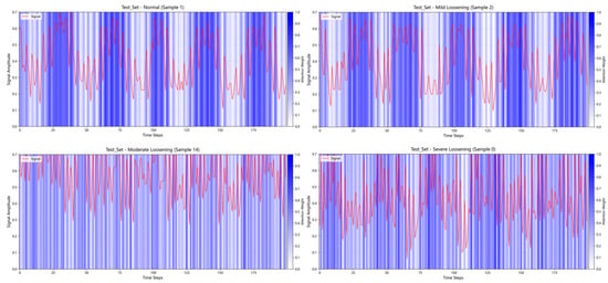 Figure 10 depicts the signal contributions for one sample from each of the four conditions in the test set. The red curves depict segments of the original vibration signals, while the blue bars represent the contribution levels of the signals to the RCDAE model. Darker blue colors represent a greater contribution of those signal segments to the RCDAE model. The RCDAE model focuses primarily on these darker-colored signal regions, assigning them larger weights. Further investigation reveals that the RCDAE model focuses primarily on peak regions within the raw signals. This occurs because vibrational impacts on bolts typically concentrate the most critical information within these peak segments. By assigning different weights to different signal segments, the RCDAE model effectively increases the proportion of valuable information in the raw signals, thereby improving diagnostic performance in downstream tasks. The figure indicates that the maximum weight values approach 1.0 while the minimum weights approach 0.0, demonstrating that different temporal data points contribute differently to the denoising process of the RCDAE model. This weighting mechanism allows the model to amplify essential features through higher weights while suppressing redundant information via lower weights, significantly improving its denoising capability.