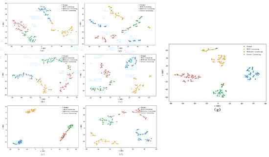 The visualization of the features of the fully connected layer using t-SNE. (a) 1DCNN, (b) WDCNN, (c) MA1DCNN, (d) CNN–BiLSTM, (e) CNN–Transformer, (f) CAE–CNN–Transformer, and (g) RCDAE–CNN–Transformer.