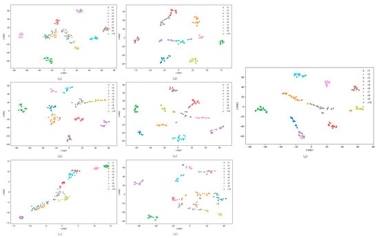 The visualization of the features of the fully connected layer using t-SNE on CWRU. (a) 1DCNN, (b) WDCNN, (c) MA1DCNN, (d) CNN–BiLSTM, (e) CNN–Transformer, (f) CAE–CNN–Transformer, and (g) RCDAE–CNN–Transformer.