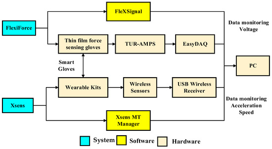 The system architecture for this study is divided into three parts: the Xsens system, the FlexiForce system, and the material sorting and processing machine. The Xsens system and the FlexiForce system include relevant sensor kits and corresponding monitoring programs for monitoring acceleration, speed, and voltage data (Figure 1). The material sorting and processing machine is a mechatronics device that is disassembled and reassembled during the experiment, comprising D/A modules as well as a piping and wiring module.