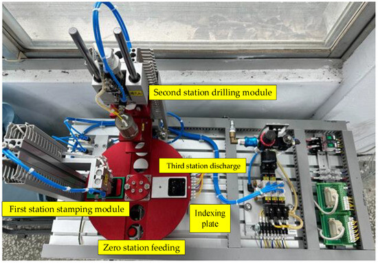 The disassembled and assembled machine for this study is a material sorting and processing machine, as shown in Figure 3. According to the working sequence, the station is classified into four modules: zero station feeding, first station stamping module, second station drilling module, and third station discharge. The actual locations are related to the module design. The basic operation process of the machine is described as follows. A workpiece is fed from the zero station, where the material sensor identifies the workpiece as either metal or non-metal material, and it is then rotated through a dividing table to the change station. When the workpiece is a non-metal material, the dividing table rotates the workpiece to the first station for stamping and then to the third station for discharge. When the workpiece is a metal material, the dividing table first rotates the workpiece to the first station for stamping and then to the second station, where it is fixed with a gripper for drilling, and finally to the third station for discharge. The equipment control functions cover emergency stop, restoration, single cycle, continuous cycle, and jump cycle.