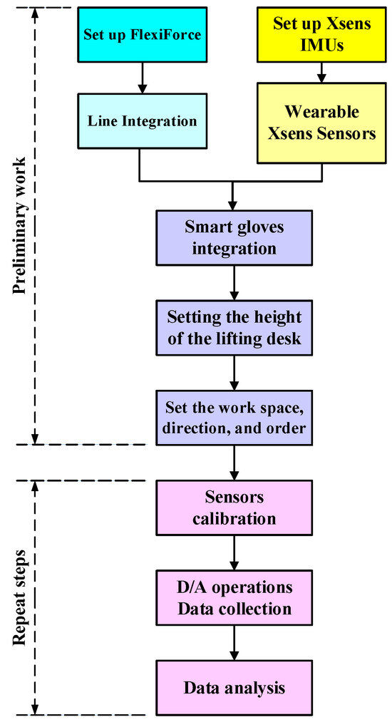 Figure 4 is the flowchart of the experiment in this study. First, FlexiForce thin-film sensor gloves and Xsens inertial measurement wireless sensors are integrated. Disassembly/assembly machine, work tables, and disassembly/assembly tools are then positioned. The equipment, circuits, and space required for the experimental process are defined and integrated to minimize interference during the disassembly and assembly processes. Xsens sensors are connected with wireless transmission. Although circuit integration is not necessary, the location of Xsens sensors should be predetermined, and the installation location and gap should be defined to minimize experimental differences. The smart thin-film sensor gloves in this study are equipped with eight FlexiForce thin-film sensors to measure the subtle forces of the fingers during disassembly and assembly. Meanwhile, the back of both hands is equipped with fixed Xsens sensors to measure dynamic inertial information during disassembly and assembly (Figure 5). The work table height and workspace are then adjusted for the disassembly and assembly experiment. The disassembly and assembly sequence is planned to confirm the machine height, the height of the adjustable table for placing parts, the disassembly and assembly sequence, and the operation space between the machine and the table. All FlexiForce thin-film sensors and Xsens sensors are calibrated before the experiment, and communication transmission is confirmed to be normal before recording experimental data. The disassembly mechanism module is planned according to AP. The mechanism module is assembled after the disassembly work is completed. Functions are tested after completing assembly. Parameter selection and output are performed after the experiment is completed for final force data analysis and inertia data analysis.