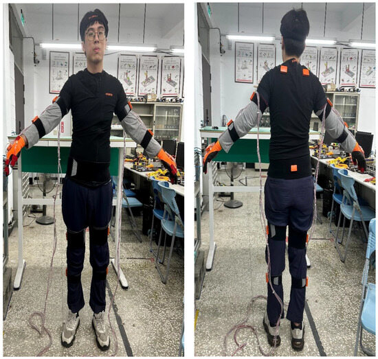 Xsens MVN (Movella Holdings Inc., El Segundo, CA, USA) [18], a motion capture system developed by Xsens in the USA, can real-time record and capture 6-degree-of-freedom data on the human body and skeleton using micro-inertial sensors. The Awinda series of Xsens MVN is utilized in the experiment presented in this study. The Awinda series, a wireless transmission version with built-in magnetic field compensation technology, can significantly reduce the calibration time for each experiment. By adding sensors, it could expand the capture part and range to more accurately and stably track body movement data.