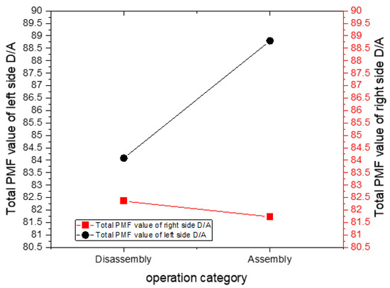 Figure 6 shows the work table being placed on the left or right side of the operator to sum up the performance index function value during disassembly. It reveals that the performance index function sum is small when executing disassembly with the work table on the right side. Accordingly, the dominant hands of the three factory workers are their right hands, and the tolerance side is the right hand when disassembling on either the left or the right. In this case, placing work tables on the right side of factory workers, with the dominant hand being the right hand, is the better location.