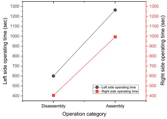 The operating times of three factory workers are shown in Figure 7. The sum of the disassembly and assembly times on the right side and the left side appears as 404 s and 993 s, respectively. The operating time for the right side is less than that of placing the adjustable work table on the right side, which is the best operating direction.