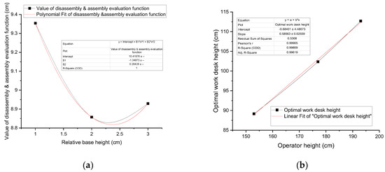 Figure 8a shows the average disassembling and assembling performance index function value of the operator at a height of 153 cm under different-height work tables. The regression analysis yields an optimal value of 8.828094574, indicating that the best work table height for a 153 cm factory worker is 89.15309457 cm.