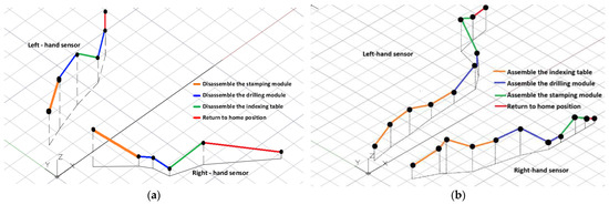 Moreover, factory workers, during disassembly and assembly work, stand stably on their lower limbs without large gait movements. They stand on fixed areas to complete all operations, without having to carry modules over long distances. In this case, the lower limbs are merely adjusted to achieve a standing posture and balance. Furthermore, the motion focuses on the arms and trunk, specifically between the waist and shoulders, during the module operation process. Additionally, the operated module weighs less than 6 kg so that factory workers are not required to exert force with their lower limbs. As a result, the data analysis extracts the data from the inertia sensors and thin-film sensors on the self-made smart gloves during the disassembly and assembly processes.